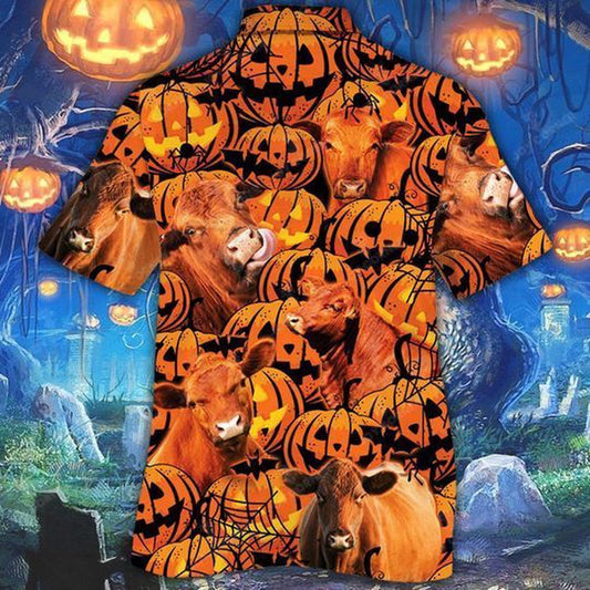 Happy Halloween Red Brahman Pumpkin All Over Printed Hawaiian Shirt, Farm Hawaiian Shirt, Farmer Hawaii