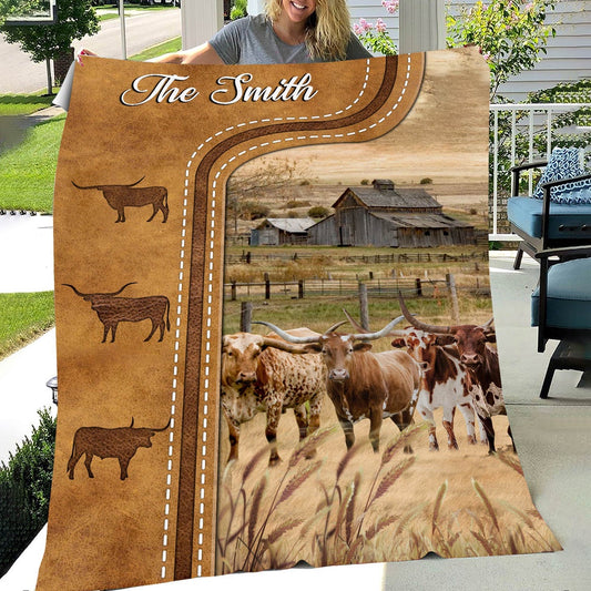 Personalized Texas Longhorn Cattle In Field Farmhouse Blanket, Farm Blanket, Farm Animal Blanket