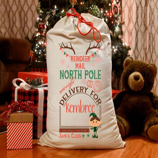 Personalised Christmas Sack, Reindeer Mail with Elf Santa Sack, Christmas Bag