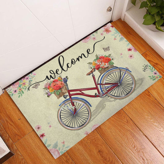 Welcome Doormat, Welcome Red Bike Bicycle with Flowers Floral Grey Welcome Doormat, Indoor Outdoor Doormat Home Decor