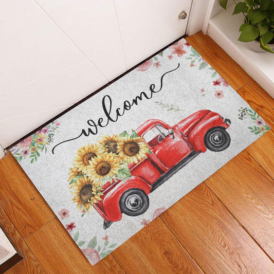 Welcome Doormat, Welcome Red Truck with Flowers Floral Farm House Grey Welcome Doormat, Indoor Outdoor Doormat Home Decor