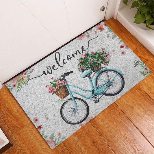Welcome Doormat, Welcome Turquoise Bike Bicycle with Flowers Floral Grey Welcome Doormat, Indoor Outdoor Doormat Home Decor