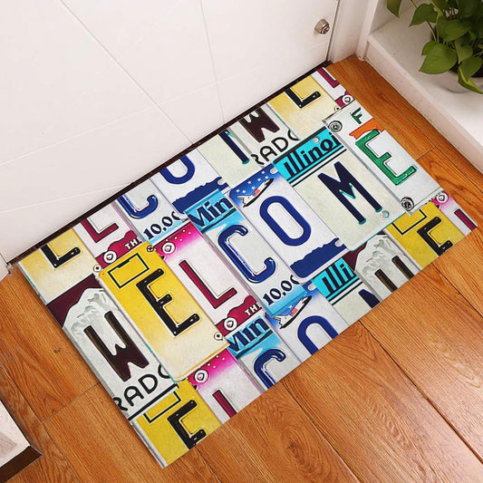 Welcome Doormat, Welcome Vintage License Plate Letters Pattern Welcome Doormat, Indoor Outdoor Doormat Home Decor
