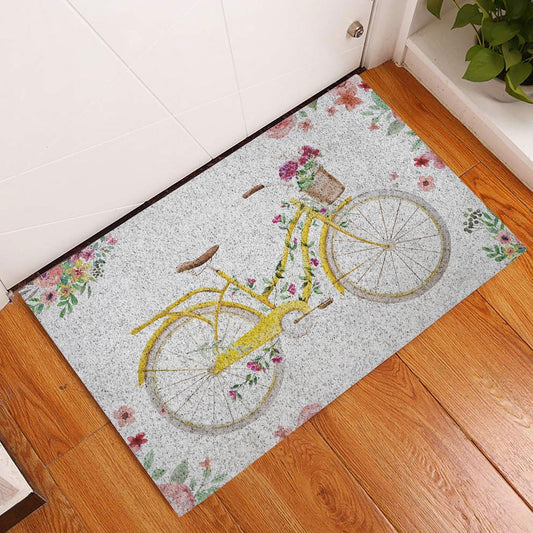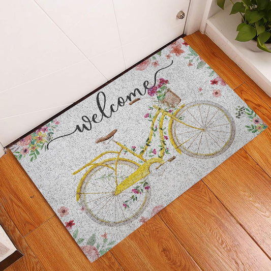 Welcome Doormat, Welcome Yellow Bike Bicycle with Flowers Floral Grey Welcome Doormat, Indoor Outdoor Doormat Home Decor