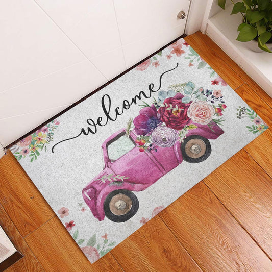 Welcome Doormat, Welcome Pink Truck with Flowers Floral Farm House Grey Welcome Doormat, Indoor Outdoor Doormat Home Decor