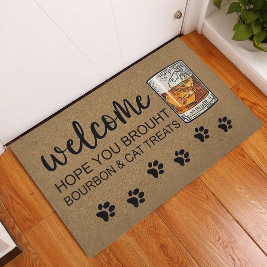 Welcome Doormat, Welcome hope you brought bourbon & cat treats Gift For Cat Lover Welcome Doormat, Indoor Outdoor Doormat Home Decor