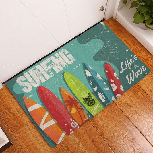 Welcome Doormat, Surfing Surfboard Life Is A Wave Beach Life Hello Summer Blue Welcome Doormat, Indoor Outdoor Doormat Home Decor