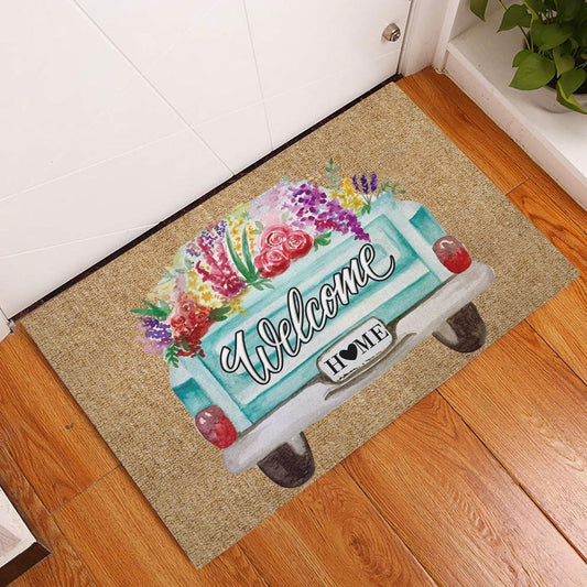 Welcome Doormat, Turquoise Truck Flower Welcome Home Gift For Housewarming Brown Welcome Doormat, Indoor Outdoor Doormat Home Decor