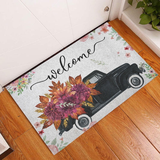 Welcome Doormat, Welcome Black Truck with Flowers Floral Farm House Grey Welcome Doormat, Indoor Outdoor Doormat Home Decor