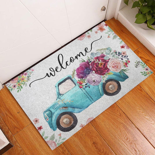 Welcome Doormat, Welcome Blue Truck with Flowers Floral Farm House Grey Welcome Doormat, Indoor Outdoor Doormat Home Decor