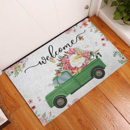 Welcome Doormat, Welcome Green Truck with Flowers Floral Farm House Grey Welcome Doormat, Indoor Outdoor Doormat Home Decor