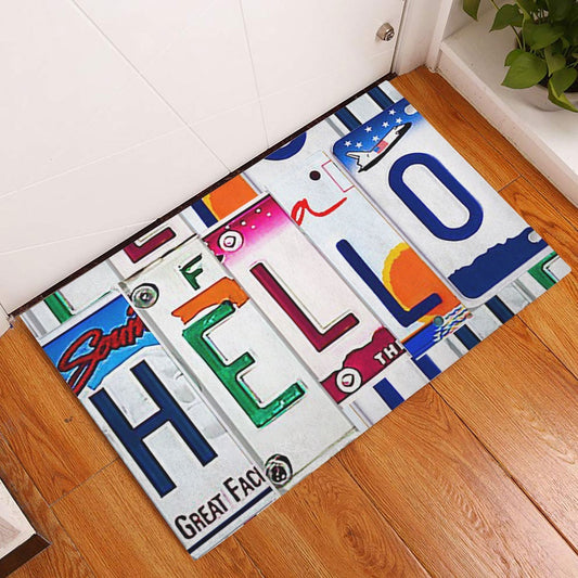 Welcome Doormat, Hello Vintage License Plate Letters Pattern Welcome Doormat, Indoor Outdoor Doormat Home Decor