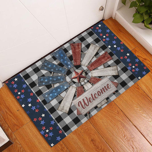 Welcome Doormat, Colorful Windmill Red Star American US Flag Happy 4th Of July Welcome Doormat, Indoor Outdoor Doormat Home Decor