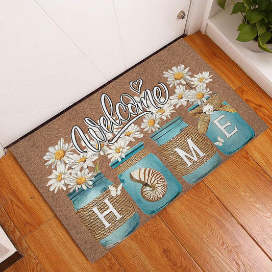 Welcome Doormat, Daisy Flower Jars Floral Home Sweet Home Brown Housewarming Gift Welcome Doormat, Indoor Outdoor Doormat Home Decor