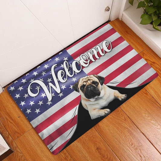 Pug Welcome Doormat, Funny Pug Dog Welcome American Flag USA Patriotic Welcome Doormat, Pets Home Decor Door Mat