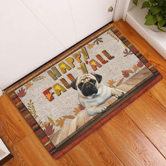 Pug Welcome Doormat, Pug Dog Happy Fall Y'all Pumpkin Spice Maple Leaf Welcome Doormat, Pets Home Decor Door Mat