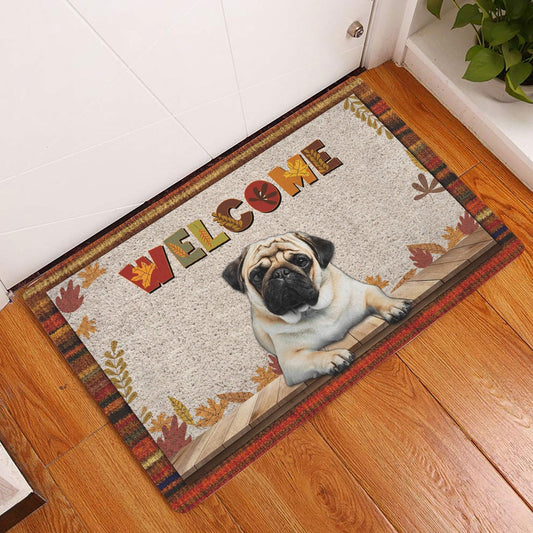 Pug Welcome Doormat, Pug Dog Welcome Fall Autumn Pumpkin Spice Maple Leaf Welcome Doormat, Pets Home Decor Door Mat
