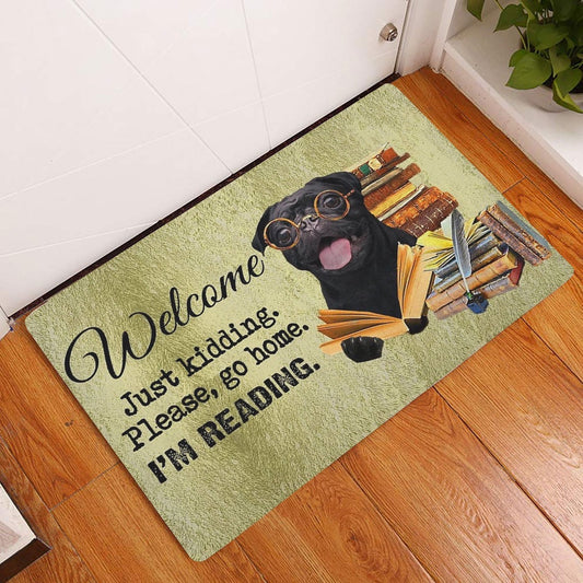 Pug Welcome Doormat, Black Pug Dog And Book Please Go Home I'm Reading Welcome Doormat, Pets Home Decor Door Mat