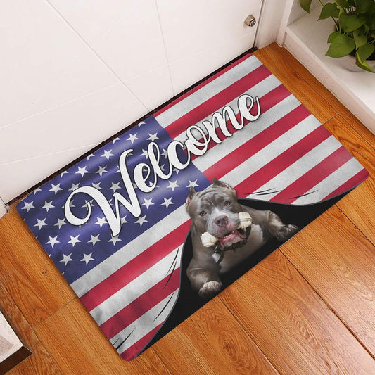 Pitbull Welcome Doormat, Funny Pitbull Dog Welcome American Flag USA Patriotic Patriotic Welcome Doormat, Pets Home Decor Door Mat