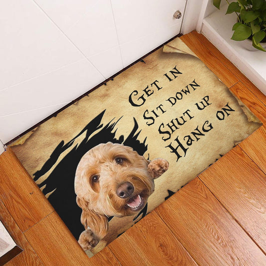 Goldendoodle Welcome Doormat, animal pet lover Goldendoodle dog get in sit down brown vintage Welcome Doormat, Pets Home Decor Door Mat