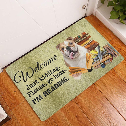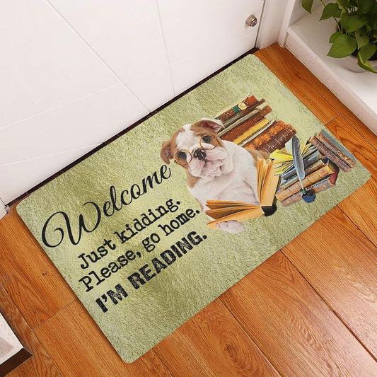 English Bulldog Welcome Doormat, English Bulldog Dog And Book Please Go Home I'm Reading Welcome Doormat, Pets Home Decor Door Mat
