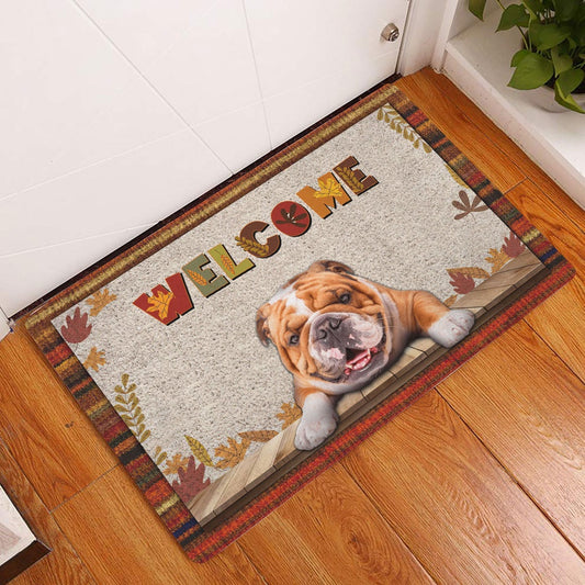 English Bulldog Welcome Doormat, English Bulldog Dog Welcome Fall Autumn Pumpkin Spice Maple Leaf Welcome Doormat, Pets Home Decor Door Mat