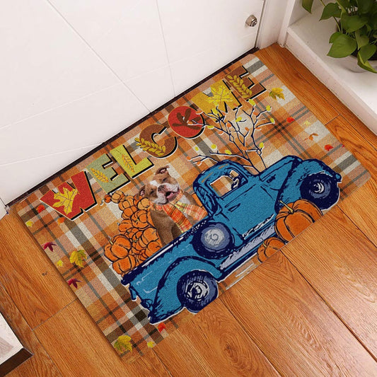 English Bulldog Welcome Doormat, English Bulldog Pumpkin Truck Welcome Autumn Happy Fall Y'all Welcome Doormat, Pets Home Decor Door Mat