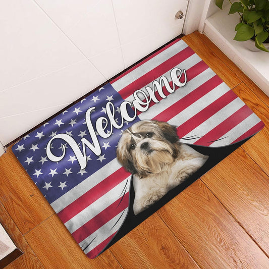 Shih Tzu Welcome Doormat, Funny Shih Tzu Dog Welcome American Flag USA Patriotic Welcome Doormat, Pets Home Decor Door Mat