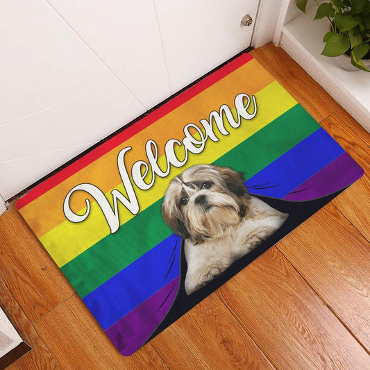 Shih Tzu Welcome Doormat, LGBT Shih Tzu Dog Welcome Pride Rainbow Flag Welcome Doormat, Pets Home Decor Door Mat