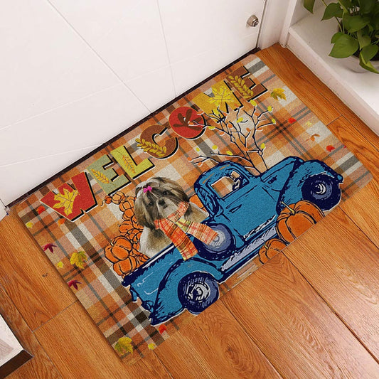 Shih Tzu Welcome Doormat, Shih Tzu Pumpkin Truck Autumn Happy Fall Y'all Thanksgiving Welcome Doormat, Pets Home Decor Door Mat