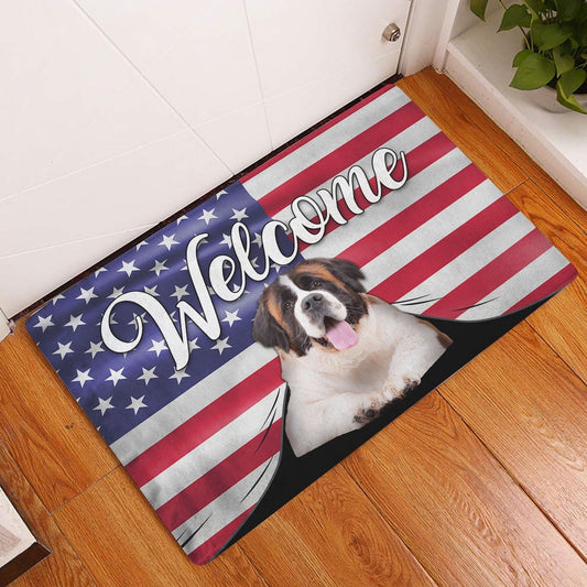 Saint Bernard Welcome Doormat, Funny Saint Bernard Dog Welcome American Flag USA Patriotic Welcome Doormat, Pets Home Decor Door Mat