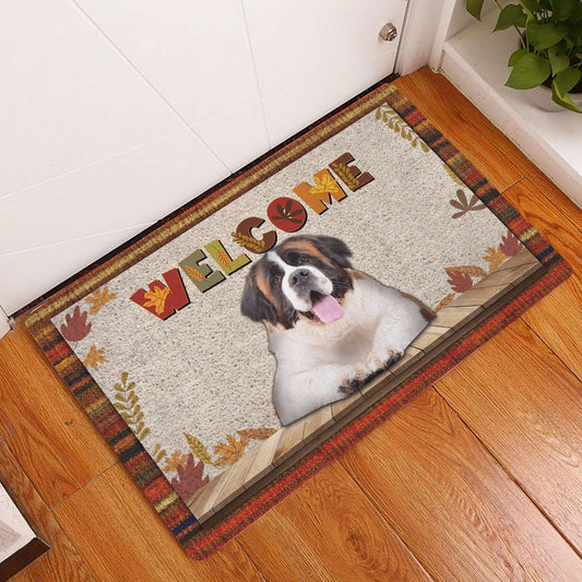 Saint Bernard Welcome Doormat, Saint Bernard Dog Welcome Fall Autumn Pumpkin Spice Maple Leaf Welcome Doormat, Pets Home Decor Door Mat