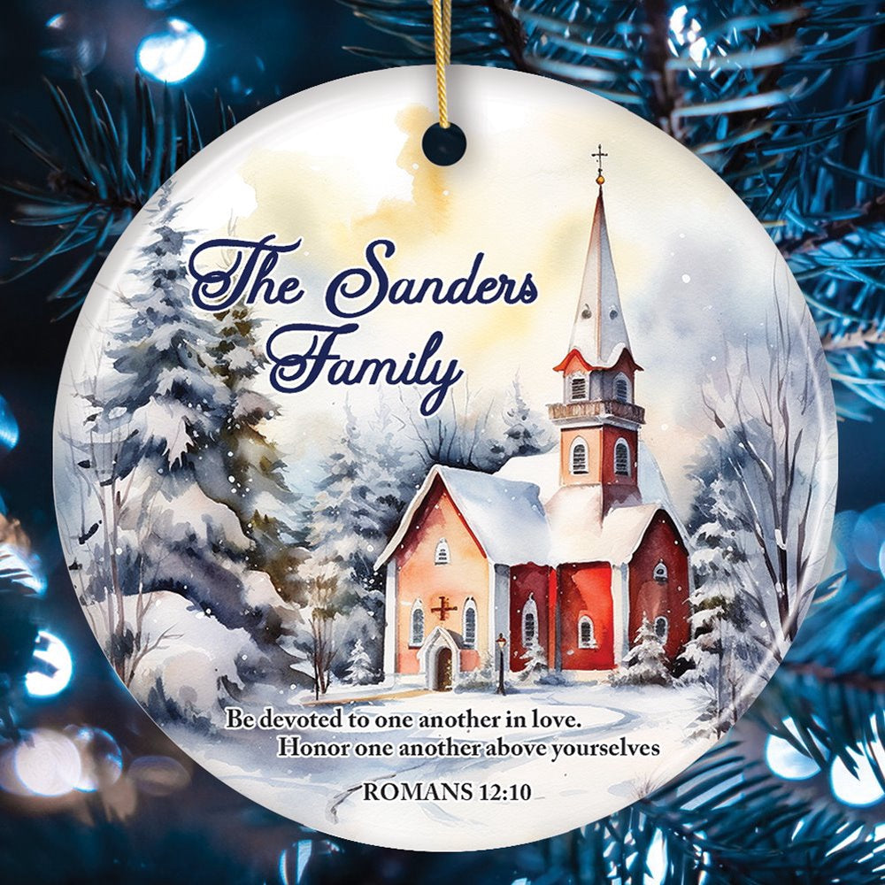 Christmas Ornament, Winter Church Watercolor Art Personalized Ornament, Christmas Gift for Christian Family