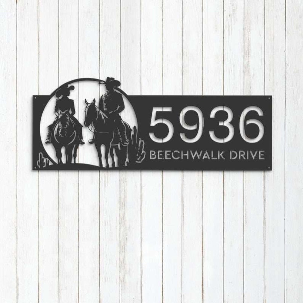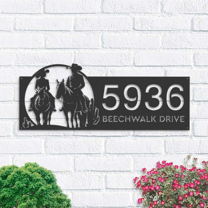Farm Metal Sign, Personalized Cowboy Cowgirl Couple Horse Rider Farm Ranch Address Sign House Number Plaque Custom Metal Sign