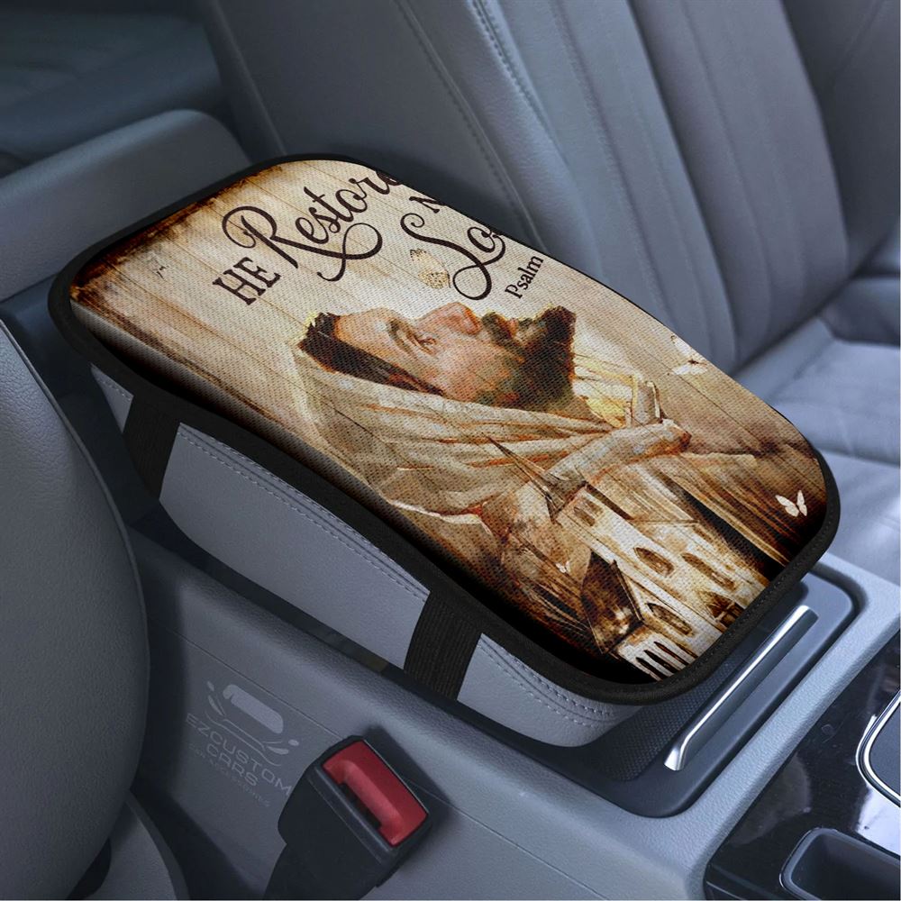 Jesus Church He Restores My Soul Car Center Console Cover, Bible Verse Car Armrest Cover