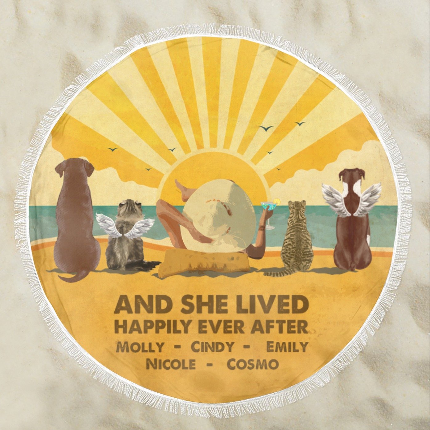 Personalized Round Beach Towel for Pet lovers - Mom with Pets on the Beach - Vintage - Choose up to 4 Pets/Dogs/Cats